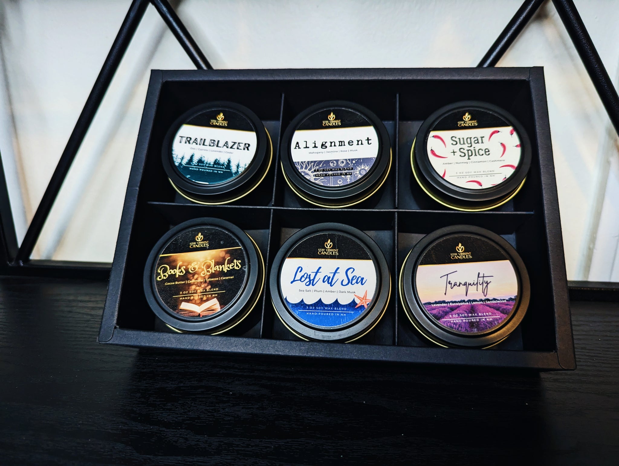 Try 6 of our 3 oz signature scents at a special price for a variety of Woodsy and cozy Fragrances.